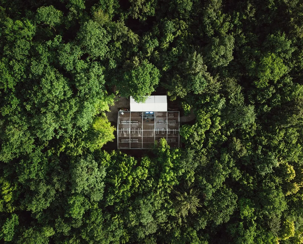 Smješten je na istoj lokaciji kao i naš veći šator, no iako su udaljeni samo 200 metara, šume koje ih okružuju i zasebni ulazi osiguravaju potpunu privatnost. Bez obzira koji šator odaberete, možete računati na intimnu i neometanu proslavu.