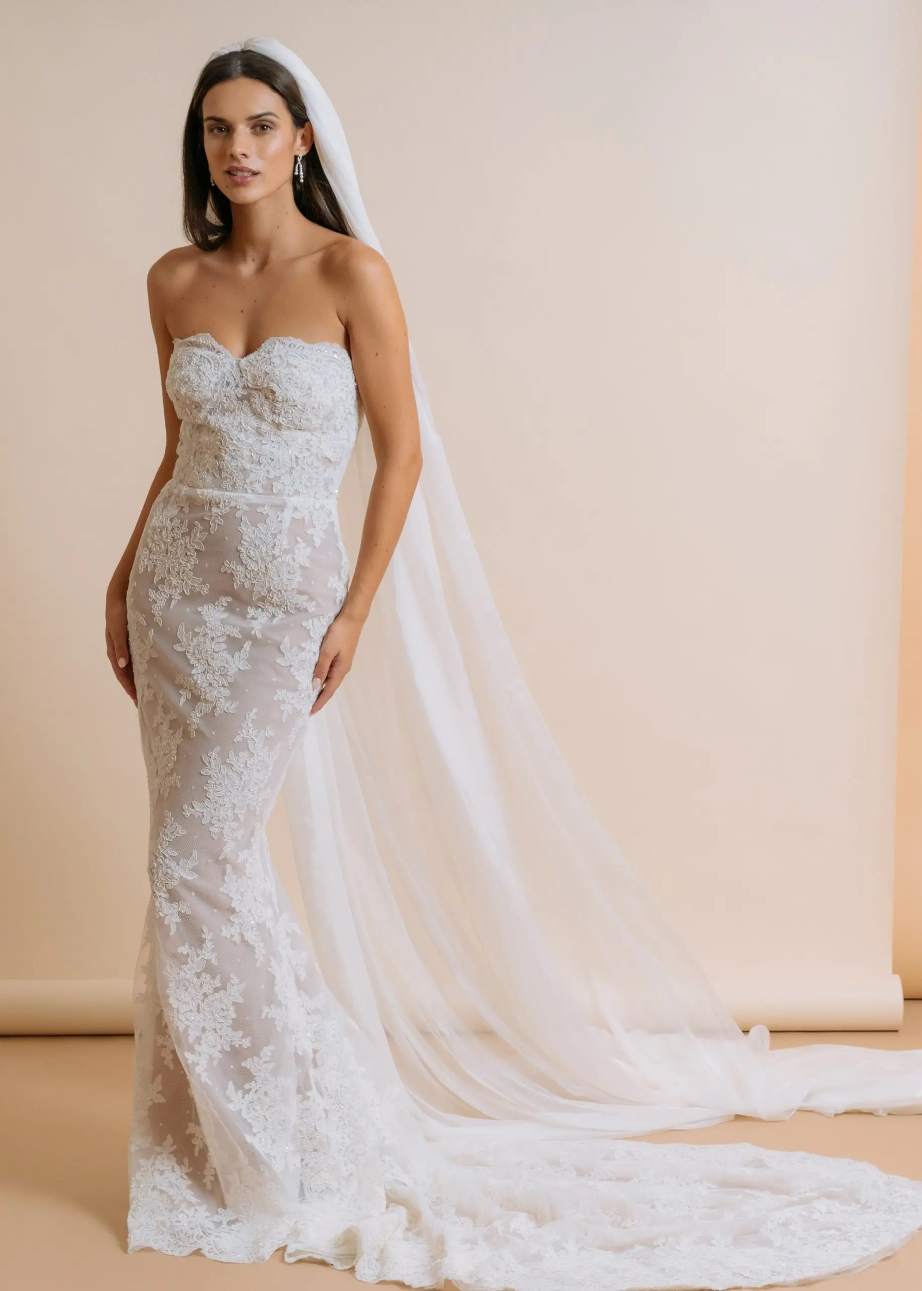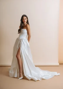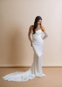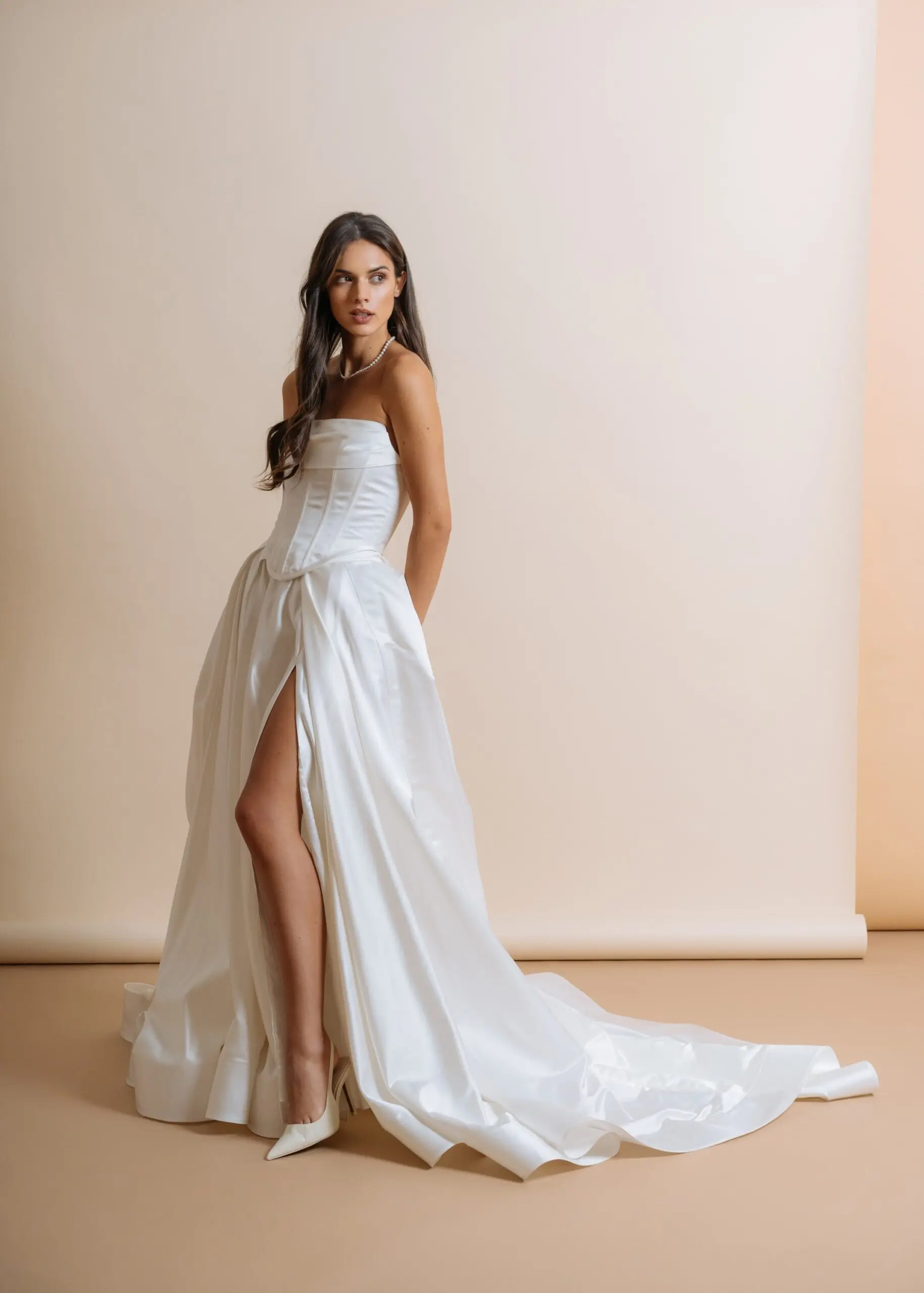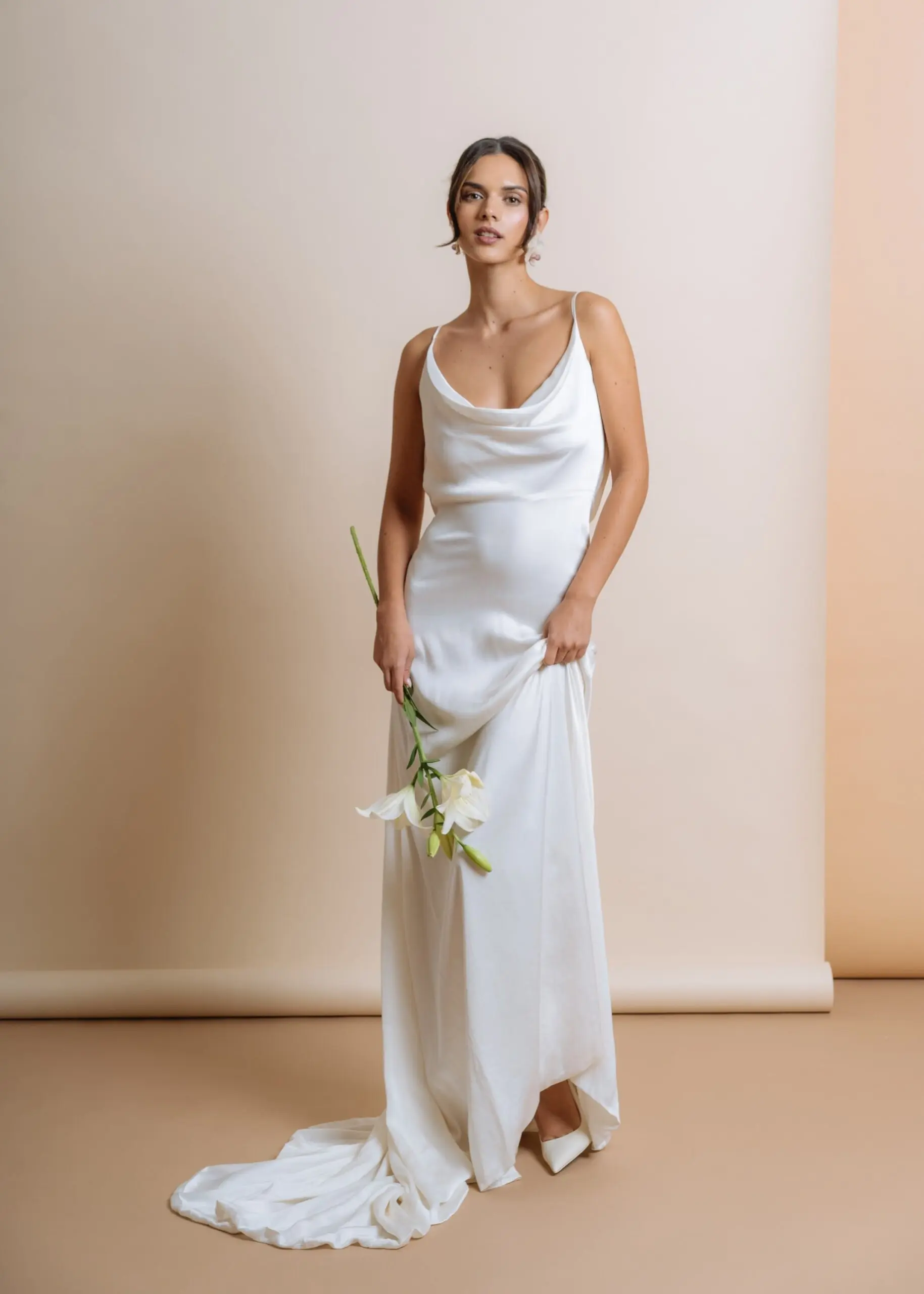 Svilena slip vjenčanica Ava sa bogatim šlepom i golim leđima. Elegantna, profinjena i atraktivna. Idealna za moderne mladenke koje cijene eleganciju i svilene materijale. Vjenčanica je izrađena od svilenog satena prekrasnog toplog sjaja.