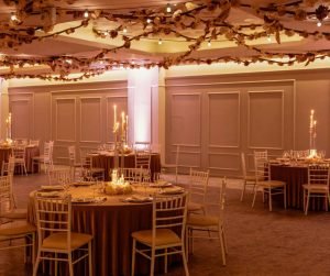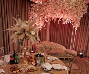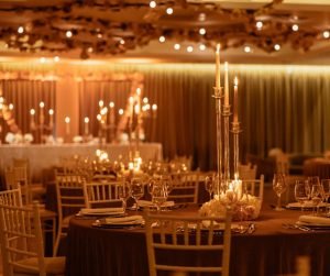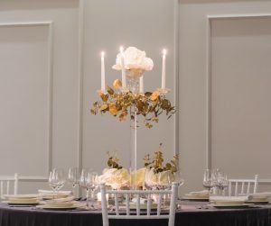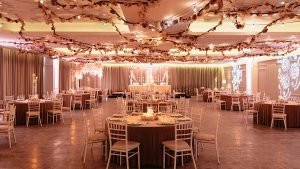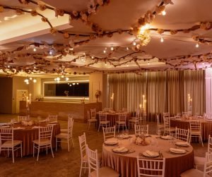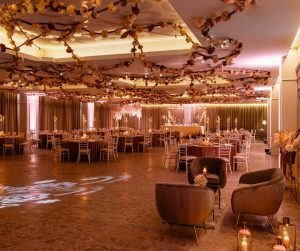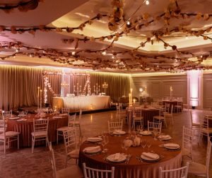 Spoj modernog i klasičnog opisuje dizajn prostrane svadbene dvorane Flores isprepletene cvjetnim ukrasima i svjetlucavim lampicama.