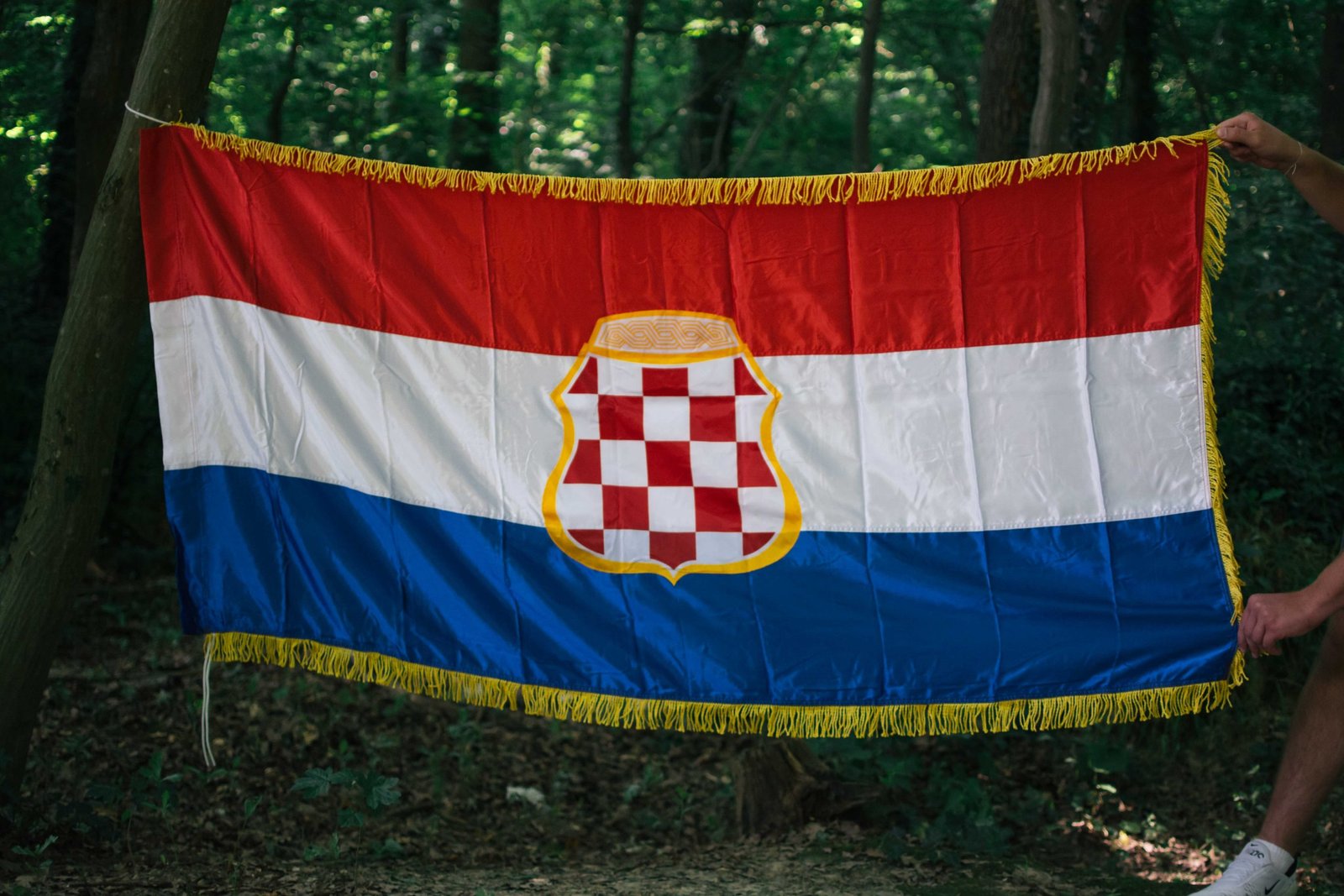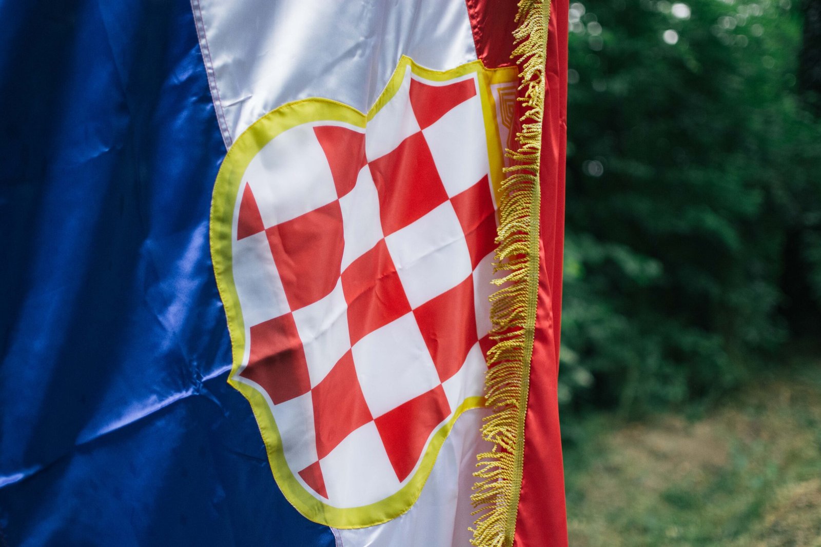 *zastava je fotografirana po kiši* Svečana trobojnica HRHB dostupna u 3 veličine. Zlatne rese, obostrano šivani grbovi, otvor za koplje, špagice za vezanje. Materijal: Saten svila, svečanog izgleda, mekana pod prstima